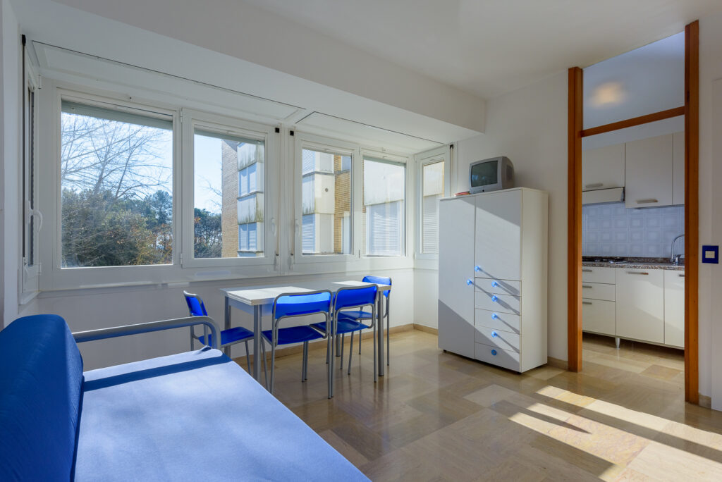 Gli appartamenti, climatizzati, sono così composti: ingresso soggiorno-pranzo con angolo cottura e divano letto per una persona, camera da letto matrimoniale, camera con due letti singoli, servizi con box doccia, porticato e posto auto numerato.